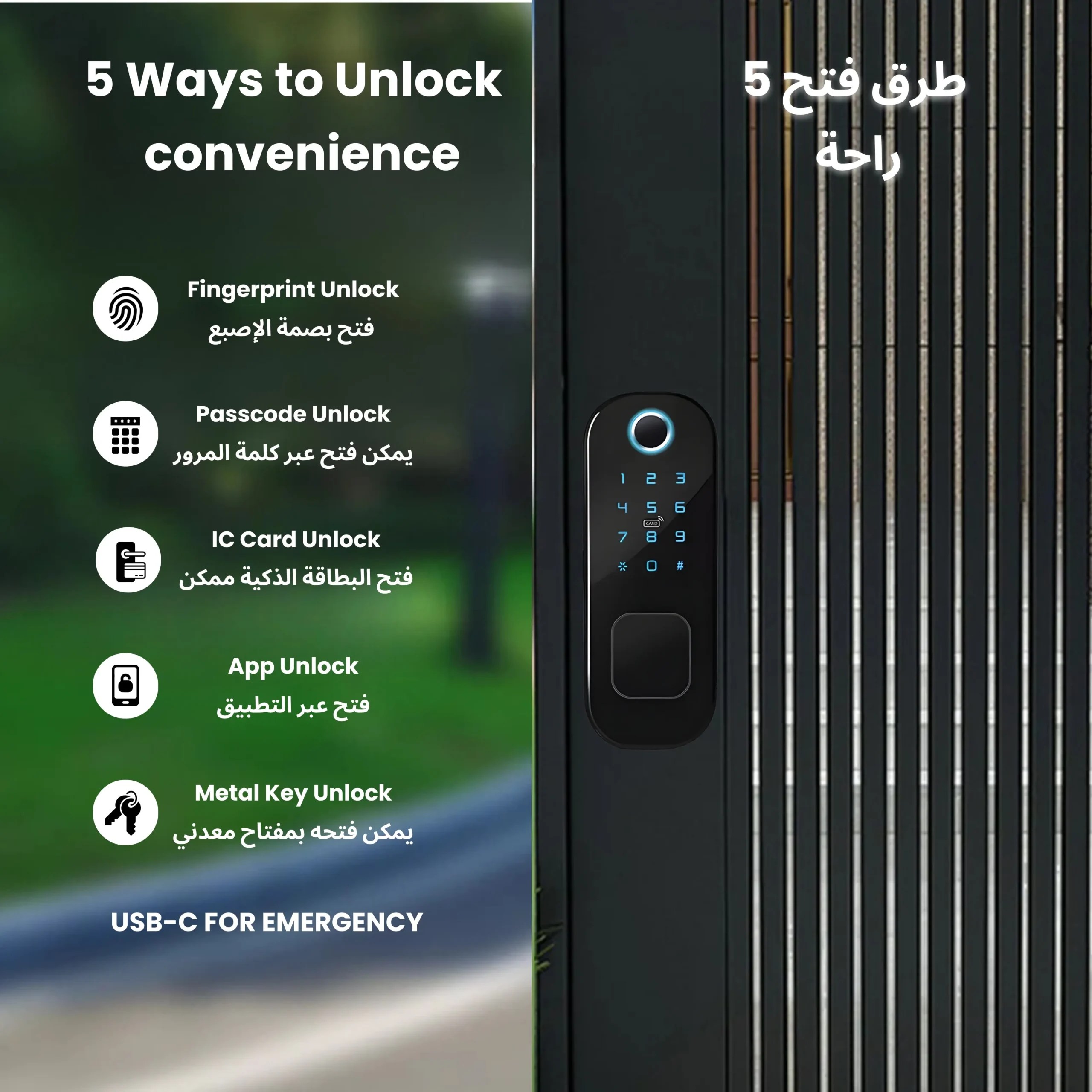 - Double-Sided Fingerprint Unlocking – Access from both sides using advanced biometric fingerprint technology for maximum security.